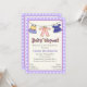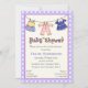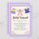 Chá personalizado de bebê em linha fechada, com convite personalizado, apresentando uma roupa linda rosa, azul, amarela, de menina na linha de roupas, o texto "chá de fraldas" em uma fonte divertida com corações e uma lavanda, roxa, bolinhas branca. Um design adorável e personalizável. Personalize-o e altere a lavanda de cores da borda. Alguns elementos de Alice Smith.