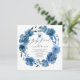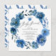 Lindo design de chá de bebê com flores azuis-navy índigo em aquarela para festa brunch com uma folha coordenada na parte de trás para um toque extra especial.