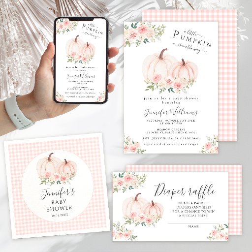 Experimente o charme de nosso elegante convite para chá de menina no outono, com duas deliciosas abóboras cor-de-água rosa, decoradas com flores creme e rosa e padrão de gingham no fundo, encapsulando perfeitamente o tema "A Little Pumpkin is on the Way". Celebre a chegada iminente do seu pequeno estilo com este convite sofisticado, ideal para acolher convidados para a sua comemoração do outono.