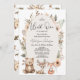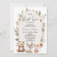 Convite de chá de bebê neutro em gênero com três animais da floresta, uma moldura oval bege e flores silvestres em tons naturais. Este convite de chá de bebê temático da floresta é ideal para um chá de bebê neutro de outono.