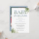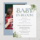 Convite de chá de bebê baby in bloom com uma elegante tipografia azul empoeirada e bela folhagem de verde botânico e sua foto especial no verso. Criado por Thisisnotme©