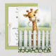 Uma girafa brincalhona espiando por cima de uma cerca branca com uma margarida na boca.