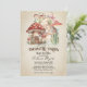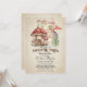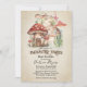 Este convite personalizado apresenta um tema de chá de bebê de jardim encantado. O fundo é um design de papel pergaminho desbotado para se assemelhar a um livro de contos de fadas vintage. Uma imagem de uma pequena casa de cogumelo e caminho que leva a um jardim de fadas encantado é mostrada na parte superior. Várias flores e cogumelos são colocados ao longo do caminho. Luzes delicadas de fadas acentuam as partes superior e inferior.