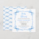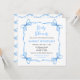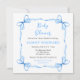 Este convite de chá de bebê fofo e caprichoso apresenta uma moldura de laço azul adorável. O texto combina fontes manuscritas e sem serifa para uma aparência elegante e moderna.