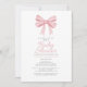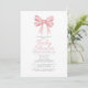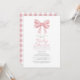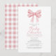 "Dê as boas-vindas à chegada de um precioso pequeno com nosso convite de chá de bebê elegante em rosa pastel e branco. Adornado com um delicado laço rosa coquette no topo, este design atemporal apresenta caligrafia e letras elegantes em rosa e cinza para apresentar os detalhes do evento. No verso, você encontrará um padrão xadrez gingham rosa e branco coordenado.