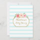 Convites personalizados de chá de bebê com padrão de listras azul celeste pastel claro e branco, detalhes em dourado e lindas flores vintage em aquarela rosa. Perfeito para um chá de bebê de primavera ou verão.