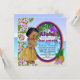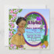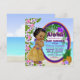 Convite de chá de bebê luau com adorável menina negra étnica vestindo uma saia hula de grama em um fundo colorido de praia tropical. Você pode personalizar facilmente este adorável convite de chá de bebê luau tropical havaiano para o seu evento, simplesmente adicionando seus detalhes no estilo de fonte e cor de sua escolha. Alguns gráficos ©delightfuldoodles.