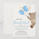 Este encantador convite de chá de bebê para menino apresenta um adorável ursinho de água-forte com balões azuis e bege. Diz "Mal Podemos Esperar" em caligrafia estilosa. É facilmente personalizável. Aquarela Original © Michele Davies.