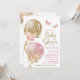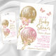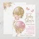 Convite de chá de bebê balão com balões rosa e dourado bonitos com flores, borboletas e laços em um fundo branco. Este convite de chá de bebê rosa e dourado é facilmente personalizado com os detalhes do seu evento. Você também pode alterar a cor do fundo neste adorável convite de chá de bebê rosa e dourado.