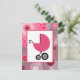 Um convite de chá de bebê de menina com uma ilustração de um carrinho de bebê rosa sobre um fundo de flores e bolinhas. Personalize o texto no verso com detalhes da sua ocasião.