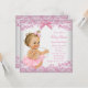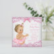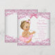 Convite de chá de bebê rosa e branco com adorável bebê menina vestindo tutu rosa e uma corda de pérolas em um belo fundo de renda e laço rosa. Este convite de chá de bebê rosa é facilmente personalizado para o seu evento, adicionando seus detalhes no estilo de letra e cor, e texto de sua escolha. Este é um design impresso sem renda real, laços, pérolas, etc.