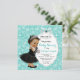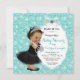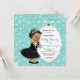 Convite de chá de bebê da Bebê & Company azul turquesa com adorável bebê étnica hispânica indiana afro-americana usando vestido preto e pérolas em um lindo fundo azul turquesa. Este adorável convite de chá de bebê preto e azul turquesa é facilmente personalizado para o seu evento, basta adicionar seus detalhes. Este design elegante é perfeito para um tema, ou um chá de bebê temático de Café da Manhã.