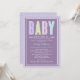 Este convite de chá de bebê ousado e moderno apresenta letras grandes e mistas "Bebê Menina" em uma suave cor lavanda roxa e branca contra um fundo cinza com uma borda de bolinhas lavanda. A paleta de cores roxa e cinza é uma escolha encantadora para um chá de bebê menina. Todo o texto é totalmente personalizável para a sua celebração.