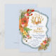 Convite de chá de bebê com galhada de veado com flores em aquarela e peças de acento de brilho e folha dourada em um fundo azul e branco. Este é um design impresso sem brilho real, etc.