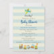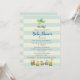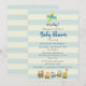 Um convite de chá de bebê menino. Projetado com uma ilustração de arte de berçário infantil fofa de um cachorrinho andando de avião e um trem de brinquedo cheio de animais caprichosos. Definido em um fundo listrado de creme e azul.