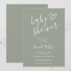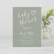 Um convite de chá de bebê minimalista moderno com um coração desenhado à mão e tipografia estilosa em um fundo verde sálvia. Criado por Thisisnotme©