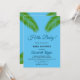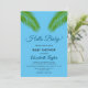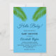 Este convite de chá de bebê de praia elegante é perfeito para um chá de bebê moderno à beira-mar no verão. O design romântico apresenta folhas de palmeira verdes com tipografia preta e azul elegante em um fundo azul-esverdeado.