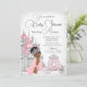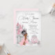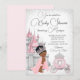Convite de chá de bebê princesa Afro cor-de-rosa e prata com adorável bebê princesa com cabelo afro fofo com coroa de diamantes e capa em um lindo fundo brilhante cor-de-rosa e prata. Este convite de chá de bebê princesa cor-de-rosa e prata é facilmente personalizado com os detalhes do seu evento.