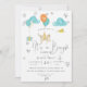 Molas e bonito aquarelas para um chá de fraldas celestial e feliz. Os balões trazem filhotes e presentes, com sutis quedas folhas de fundo.Um padrão de nuvem em sentido inverso. Chá de fraldas temático "é um menino!".