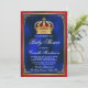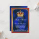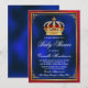 Convite de chá de bebê real com linda coroa vermelha e dourada em um belo fundo azul real, vermelho e dourado. Você pode alterar o texto conforme necessário para o seu evento. Imprima em papel brilhante para obter os melhores resultados.