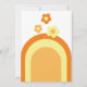 Um convite de chá de bebê retrô em tons de laranja e amarelo, com um arco-íris e fontes funky com efeito de texto sombreado retrô para o título.