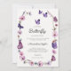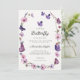 Uma ilustração encantadora de aquarela com um tema "Pequena Borboleta", com borboletas roxas e flores silvestres roxas e cor-de-rosa em um estilo bonito e adorável decora este convite de chá para menina que é perfeito para uma celebração de primavera ou verão.