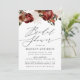 Convite de chá de panela elegante e rústico com um buquê de rosas e folhagens em aquarela em tons de borgonha, marfim, ferrugem, marrom e verde. Personalize o convite adicionando os detalhes do seu chá de panela acentuados por uma caligrafia moderna. O convite de chá de panela floral borgonha se inverte para exibir um fundo borgonha/vermelho ferrugem escuro. Projetado para coordenar com nossa coleção de casamento Rosas Rústicas Borgonha e Marfim.