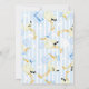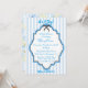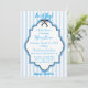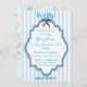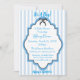 Celebre a chegada do seu pequeno pacote de alegria. Este convite de chá de fraldas azul é um tema listrado para um bebê. A parte frontal apresenta um fundo azul, distribuído verticalmente, com um rótulo azul e branco. As costas mostram uma cegonha com "É um menino". Compre seu convite de chá de fraldas hoje! Trabalho de arte criado por: AMBilustrations http://www.etsy.com/shop/AMBillustrations Convite Design: MissRhoadie1981