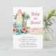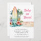 Um convite de chá para uma menina, com um tema de surfe, adorava cenas de praia com aquarela, árvores tropicais, palmeiras, praias arenosas e um prato azul e rosa, e "Bebê no Conselho" em um divertido roteiro retrorreflector rosa. Adicione o nome da futura mãe e os detalhes do chá em simples caracteres modernos.