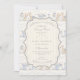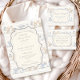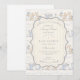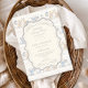 Um doce design inspirado no vintage que apresenta laços azuis delicados, detalhes de listras suaves e ilustrações encantadoras de jardim de mirtilos. Arte no estilo Toile com animais adoráveis e cestas de frutas cria uma sensação clássica de livro de histórias em uma paleta de azul suave em pó. A moldura central ornamentada adiciona elegância, mantendo o visual geral leve, refinado e atemporal. Perfeito para um chá de bebê com um tema de jardim suave e um toque de charme tradicional.