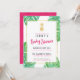 Convites modernos e ousados de chá de bebê em rosa choque e dourado com destaques em rosa choque, um abacaxi com efeito de folha de ouro e folhas tropicais em aquarela em volta da borda.