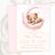 Convite de chá de bebê de ursinha com uma adorável ursinha bebê com laço fofo em um fundo de lua sonhadora. Este convite de chá de bebê ursinho é facilmente personalizado com as informações do seu evento.