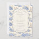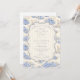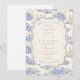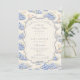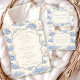 Um doce design inspirado no vintage que apresenta laços azuis delicados, detalhes de listras suaves e ilustrações encantadoras de jardim de mirtilos. Arte no estilo Toile com animais adoráveis e cestas de frutas cria uma sensação clássica de livro de histórias em uma paleta de azul suave em pó. A moldura central ornamentada adiciona elegância, mantendo o visual geral leve, refinado e atemporal. Perfeito para um chá de bebê com um tema de jardim suave e um toque de charme tradicional.