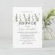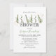 Convite de chá de bebê botânico natural elegante com um fundo branco estiloso que pode ser alterado para qualquer cor, bela folhagem verde rústica aquarela, detalhes em dourado brilhante e um modelo de celebração de chá de bebê de casal que é fácil de personalizar.
