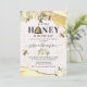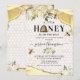 Convites de chá de bebê com colmeia de abelha com bordas de cristal de ágata brilhante amarelo e dourado, fundo de favo de mel, gotas de mel, flores em aquarela branca, abelhas e um modelo de celebração elegante que é fácil de personalizar.