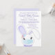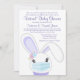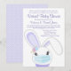 Convites de chá de bebê virtual de menina com adorável coelhinho de bebê menina usando máscara em um fundo roxo lavanda com bolinhas. Este convite de chá de bebê pelo correio é facilmente personalizado com os detalhes do seu evento.