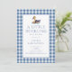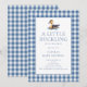 Chá de Bebê Xadrez Azul Pato. Disponível digitalmente e impresso. Um design moderno com uma ilustração de patinho fofa e fundo xadrez azul. Personalize facilmente as palavras para o seu.