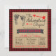 Convites de chá de bebê de lenhador com pés de bebê e flechas em um papel Kraft e fundo xadrez búfalo. Este convite de chá de bebê para uma aventura Boho começa facilmente personalizado para o seu evento, basta adicionar seus detalhes.
