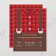 Um convite criado criativamente para parecer uma roupa de lenhador de camisa de xadrez de búfalo vermelha, suspensórios castanhos e calças. Perfeito para a mãe ser quem espera um bebê! Personalize facilmente com os detalhes do seu chá de fraldas no espaço fornecido.