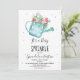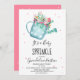 Um regador floral giro e moderno desenhado à mão pode ilustrar com flores cor-de-rosa, verdes, azuis, corações e confetti e uma fonte legal É um convite para chás de fraldas de borboleta num fundo totalmente personalizável. As cores do bolinhas são editáveis e móveis.