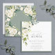 Casais quadrados modernos, elegantes, convite para chás com cinzas verdes, folhas botânicas verdes e eucalipto, e bordadinhos em verde-cinza azul de eucalipto pálido. Personalize os detalhes do chá de seus casais em branco suave, acentuado com uma bela caligrafia manual. A parte traseira da placa apresenta os botânicos florais com aquarela em uma coroa sobre a textura verde da cinza azul. Copyright Elegant Invites, todos os direitos reservados.