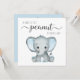 Um belo casal de um bebê chá com "Um Doce Pequeno Amendoim Está A Caminho" escrito em tipografia moderna de cinza mole e um roteiro de na moda com pinceladas e uma aquarela azul pastel de um elefante bebê. Personalize os nomes da mãe e do pai e os detalhes do chá em uma simples tipografia de cinza no verso.