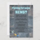 Simples tema de pesca convites para chás de bebês - O gênero revela que o convite diz 'Pescar por algumas notícias?' em divertida e azul de bebê no topo. Personalizado com os nomes dos futuros pais e lê-se "estão a ter um filho!" em letra manuscrita. Enquadrado em madeira rústica e acinzentada com balde fofo de peixe e vara de pesca no canto inferior. Introdução e detalhes do chá a preto sobre fundo de cinza escura. O dorso tem uma coordenação, fundo azul sólido. Alterar as cores de fundo em ambos os lados. Use o botão Personalizar para alterar qualquer coisa - estilos de fonte, tamanhos, cores ou posicionamento. Festa de chá de bebês giros e giros convida para chás casuais, chás de verão ao ar livre e temas de país. Temos mais suprimentos e decorações para chás de fraldas no nosso compro Zazzle.com/angela65*.
