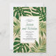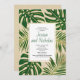 Folhas tropicais verdes e douradas, convite para chás de casais de casamento. Apresenta folhas de Split Leaf Philodendron (Monstera deliciosa) ou de Queijo Suíço e folhas de palma em verde com contorno de ouro sobre o bege. A sua redação está num quadro branco com contorno dourado. O verso inclui um padrão de bolinhas dourada.