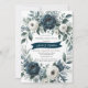 Um casamento sofisticado com um marinho azul-d'água, coroa corada floral, enfeitado com peonias, rosas e verde eucalipto em tons de azul marinho, verde e marfim. A design é aprimorada por uma caixa de cinza prateada, impressa abaixo da coroa, com layout de texto de fonte moderno. O verso do convite continua o tema com arranjo floral correspondente para um olhar coeso e elegante. Perfeito para casais que buscam eterno e papelaria de casamento clássico.
