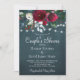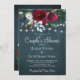 Na moda de casal de convite para o chá do modelo do rustic de inverno num quadro azul escuro da meia-noite, com um belo buquê de burgundy e de pénia branca com folhagem sazonal verde-escura, cordas de luzes brilhantes brancas e um roteiro de tipografia quic. +++++++++++++++ Fácil de personalizar com seus detalhes! +++++++++++++++++ O convite é adequado para um elegante inverno moderno fazenda de campo rústico caseiro de Natal chá, noivado ou outras festas de casal.