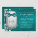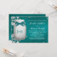 Um lindo e verde turquesa azul-azul-azul-azul-azul-azul-azul abraça um vagabundo de casal de jarro de mason que parece brilhar. Adicione as iniciais e/ou o monograma da noiva e o noivo ao frasco com uma design de aspecto azul e branco impressos. Uma sutil borda de renda úmida e velha elogia esta design russa, mas elegante, com dentro de vagalumes encantadores e fora do pote. Estes convites são bonitos para um chá ou festa de noivado noturna, para um quintal, uma fazenda ou um campo. Trabalho de arte © Chrissy H. Estúdios, LLC. Todos os direitos reservados.