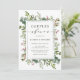 Este convite para chás apresenta cor d'água pintada de eucalipto, folhas verdes, bagas vermelhas, ramificações de pínus, e um quadro retangular verde com caligrafia na moda. Para personalização mais avançada deste design, clique no link "Personalizar mais". Itens correspondentes também estão disponíveis.