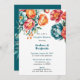 Um arranjo floral vívido e detalhado que mostra peões em turquesa, laranja e matizes. As pétalas ricas e em camadas e os centros luminosos são complementados por folhas verdes e flores de laranja menores. O buquê é composto artisticamente pelas flores radiando para fora, evocando elegância e harmonia.