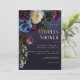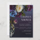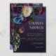 Este design de convite para chás de casamento apresenta um fundo azul-marinho escuro e temperado com um lindo spray floral de azul roxo, marrom, branco e azulejo com folhagem verde-escura e amoras roxas escuras. Criado pela imprensa simplesmente de farmácia.